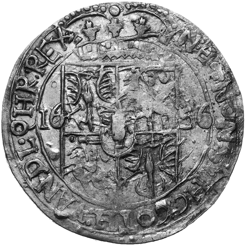 Popiersie Jana Kazimierza Wazy zwrócone w prawo, w koronie i zbroi karacenowej z wykładanym kołnierzem koronkowym. Naramiennik zbroi zbudowany z folg zdobionych okrągłymi nitami. Skrzydełko zbroi obwiedzione pierścieniami. Pierś króla zdobi order Złotego Runa na wstędze. Po bokach popiersia cyfry 1-8. Pod popiersiem herb miasta Lwowa w owalnej tarczy.