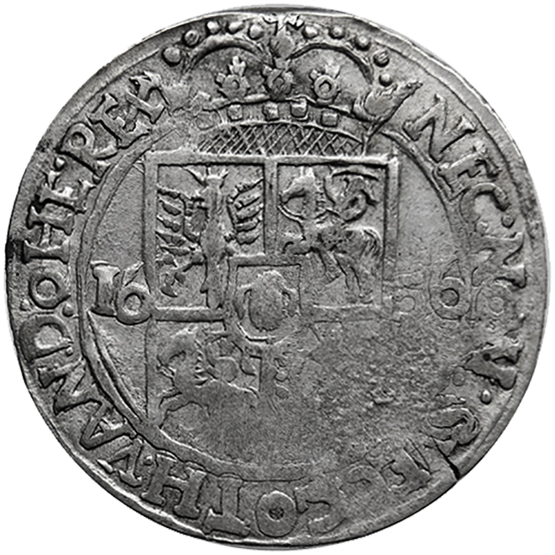 Popiersie Jana Kazimierza Wazy zwrócone w prawo, w koronie i zbroi karacenowej z wykładanym kołnierzem koronkowym. Naramiennik zbroi zbudowany z folg zdobionych okrągłymi nitami. Skrzydełko zbroi obwiedzione pierścieniami. Pierś króla zdobi order Złotego Runa na wstędze. Po bokach popiersia cyfry 1-8. Pod popiersiem herb miasta Lwowa w owalnej tarczy.