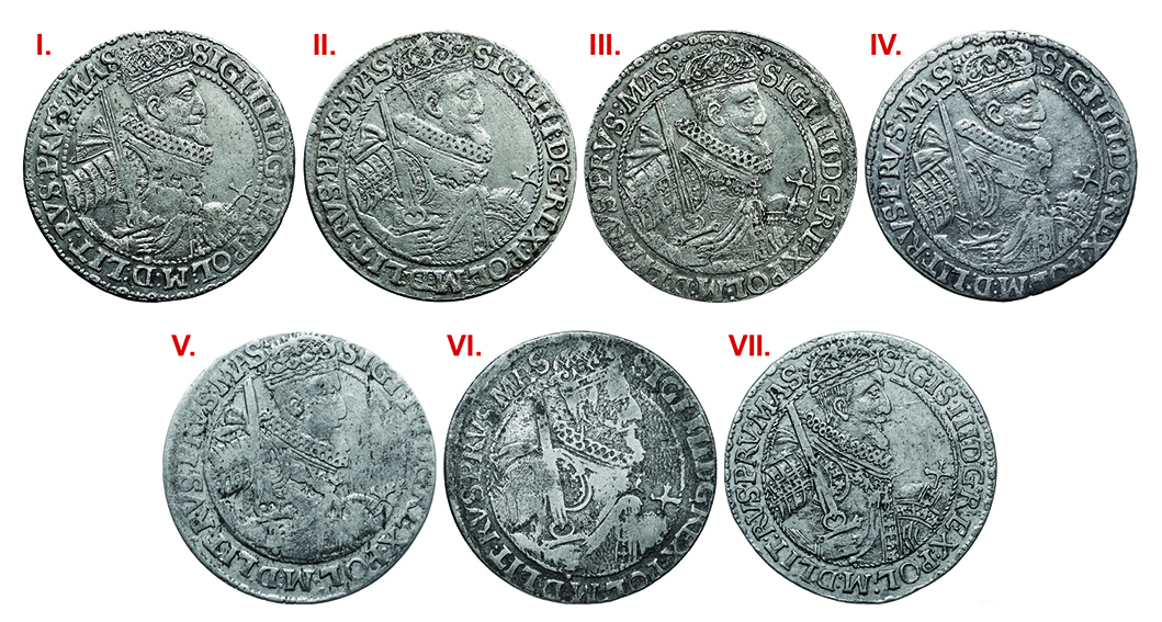 Rycina 1. Awersy ortów bydgoskich Zygmunta III Wazy z 1621 roku, których rewersy są pozbawione labrów