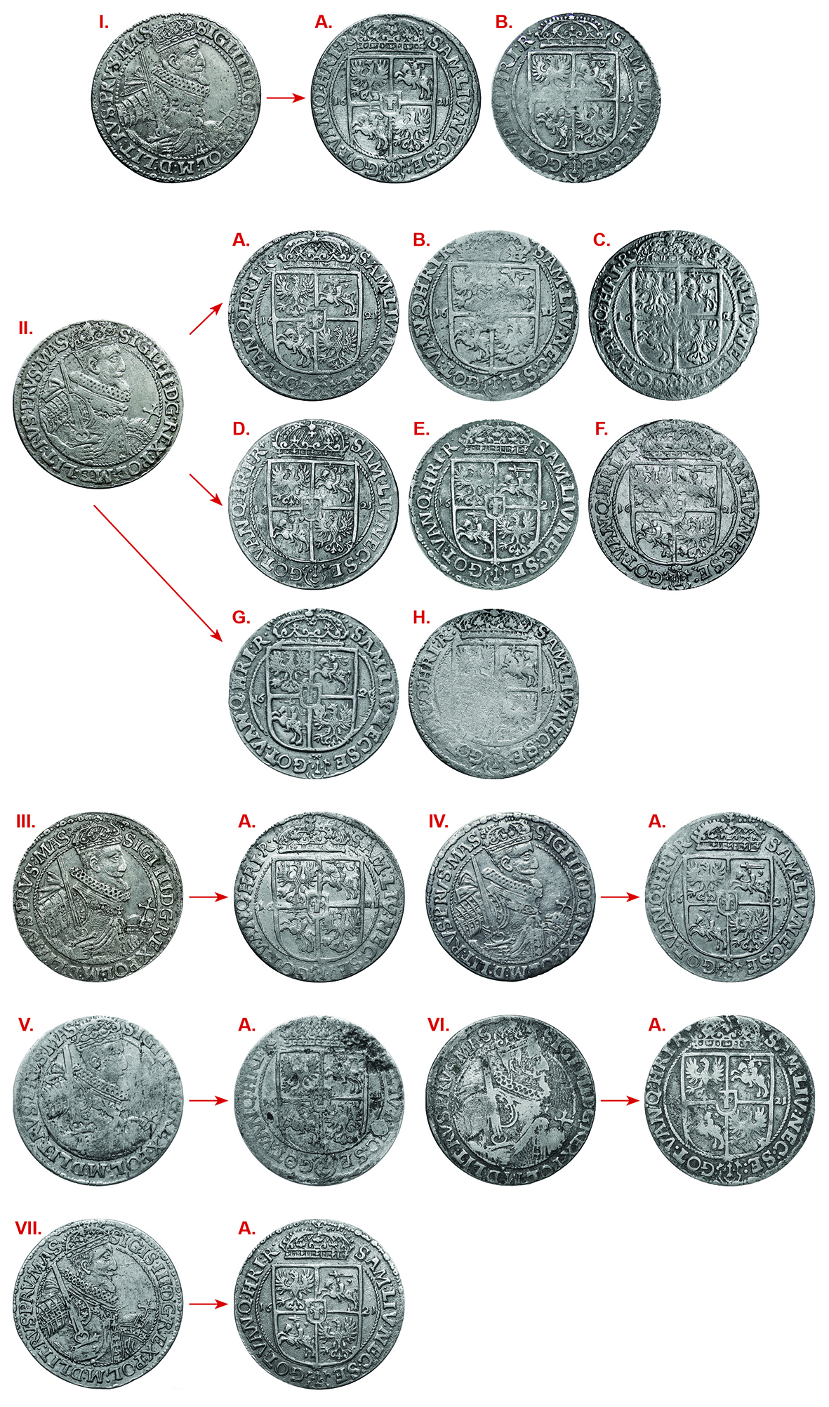 I.A (2 egz. zbiory prywatne, 4 notowania), I.B (2 egz. zbiory prywatne, 4 notowania), II.A (MNW NPO132699, MNW NPO132715-Potocki 6500, 3 egz. zbiory prywatne, 4 notowania), II.B (2 egz. zbiory prywatne, 2 notowania), II.C (1 egz. zbiór prywatny, 2 notowania), II.D (MNW NPO139545, 1 egz. zbiór prywatny, 1 notowanie), II.E (2 egz. zbiory prywatne), II.F (3 notowania), II.G (1 egz. zbiór prywatny, 1 notowanie), II.H (1 notowanie), III.A (NMW NPO132711-Potocki 6499, 2 notowania), IV.A (1 egz. zbiór prywatny, 2 notowania), V.A (1 notowanie), VI.A (1 egz. zbiór prywatny, 1 notowanie), VII.A (4 notowania)